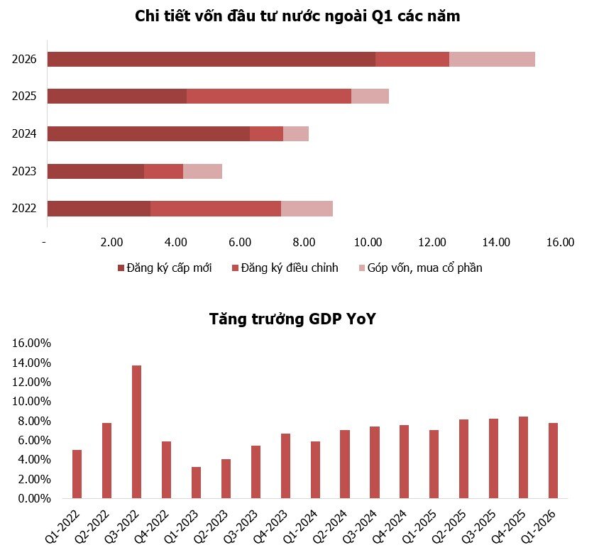 Điểm sáng tới từ FDI khi số liệu phục hồi khá tích cực, tính đến thời điểm 31/3/2026, tổng vốn FDI đăng ký vào VN đạt 15,2 tỷ USD (+42,9% YoY). Cụ thể, số vốn FDI đăng ký cấp mới trong đạt 10,23 tỷ USD với 904 dự án được cấp phép, tăng gấp 2,4 lần về số vốn đăng ký và tăng 6,4% so với cùng kỳ năm trước về số dự án. FDI thực hiện trong Q1/2026 đạt 5,4 tỷ USD, cũng là con số cao trong nhiều năm trở lại đây.