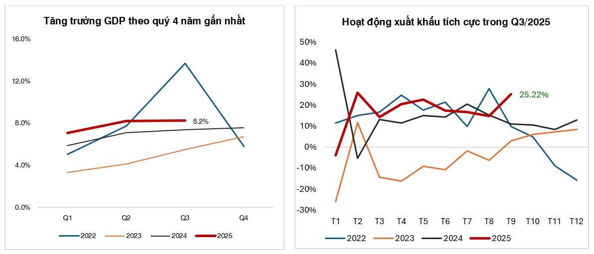 Tổng sản phẩm trong nước (GDP) quý III/2025 ước tính tăng 8,23% so với cùng kỳ năm trước, chỉ thấp hơn mức tăng 14,38% của cùng kỳ năm 2022 trong giai đoạn 2011-2025. Đây là mức tương đối cao so với cùng kỳ các năm trước đây. Tính chung 9T2025, GDP tăng 7,85% YoY – đang thấp hơn mức 8-8,1% mục tiêu. Trong đó, khu vực nông, lâm nghiệp và thủy sản tăng 3,83%, đóng góp 5,36% vào mức tăng tổng giá trị tăng thêm của toàn nền kinh tế; khu vực công nghiệp và xây dựng tăng 8,69%, đóng góp 43,05%; khu vực dịch vụ tăng 8,49%, đóng góp 51,59%.