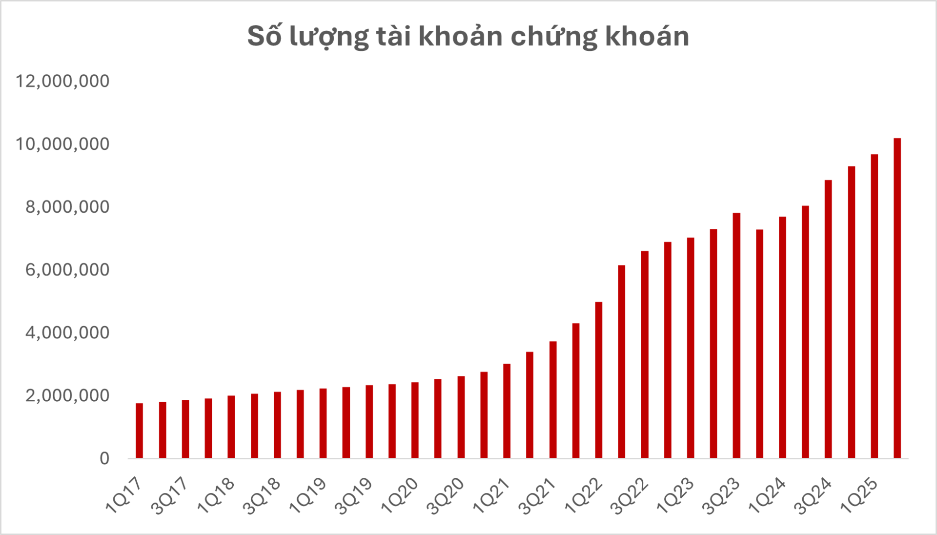 Một diễn biến khác, tính tới cuối tháng năm, số tài khoản chứng khoán cũng chính thức cán đích 10 triệu, tăng đều đặn nhưng không quá mạnh trong nhiều tháng qua. StockLine cho rằng đây cũng là một yếu tố tạo ra tăng trưởng tự nhiên của dư nợ margin. Vì vậy việc tiếp tục tăng trưởng dư nợ cùng với quy mô nhà đầu tư, quy mô vốn của CTCK là điều sẽ còn tiếp diễn trong tương lai.