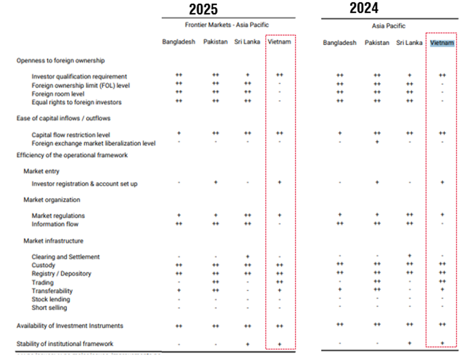 MSCI vừa công bố kết quả phân loại thị trường năm 2025, qua đó Việt Nam vẫn không có thay đổi thứ hạng, và thậm chí là không có bước tiến gì trong các tiêu chí đánh giá cụ thể trong 1 năm qua, bất kể những nỗ lực thay đổi trong thời gian gần đây.