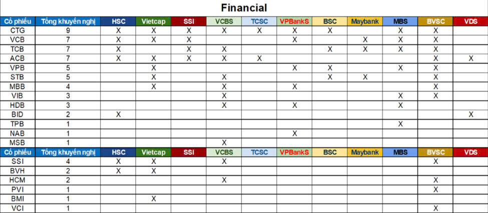 Cùng StockLine nhìn lại những lựa chọn từ các đơn vị phân tích qua thống kê (sưu tầm) dưới đây. Hầu hết các CTCK cũng đồng thuận đánh giá tích cực với nhóm Ngân hàng cho năm mới. Với 11 CTCK trong thống kê này, có tới 9 đơn vị lựa chọn CTG là cổ phiếu yêu thích cho 2025. Liền phía sau là VCB TCB và ACB với 7 lượt lựa chọn. CTG và TCB cũng đang là những cổ phiếu thể hiện tốt nhất trong những tuần đầu tiên của năm mới. Những lựa chọn “độc đáo” trong nhóm này đến từ TPB ((MBS lựa chọn), NAB (VPBank Sec lựa chọn), MSB (VCBS) lựa chọn. Trong nhóm cổ phiếu tài chính khác (Chứng khoán, Bảo Hiểm…) Lựa chọn ấn tượng nhất đang là BVH được đồng thuận lựa chọn bởi HSC và Vietcap.